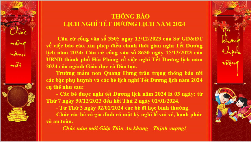Căn cứ công văn số 3505 ngày 12/12/2023 của Sở GD&ĐT về việc báo cáo, xin phép điều chỉnh thời gian nghỉ Tết Dương lịch năm 2024; Căn cứ công văn số 8650 ngày 15/12/2023 của UBND thành phố Hải Phòng về việc nghỉ Tết Dương lịch năm 2024 của ngành Giáo dục và Đào tạo.