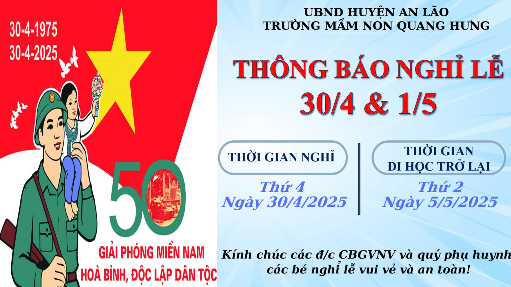 Hòa chung không khí thiêng liêng, tự hào của cả nước hướng về ngày 30/4 – Ngày Giải phóng miền Nam, thống nhất đất nước và 01/5 – Ngày Quốc tế Lao động, Trường Mầm non Nậm Loỏng xin trân trọng thông báo đến toàn thể phụ huynh học sinh lịch nghỉ lễ như sau: