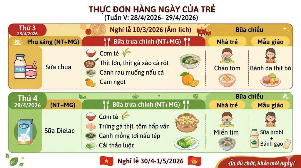 💖 Trường Mầm non Quang Hưng trân trọng gửi tới quý phụ huynh thực đơn tuần V (28/4 – 29/4/2026).